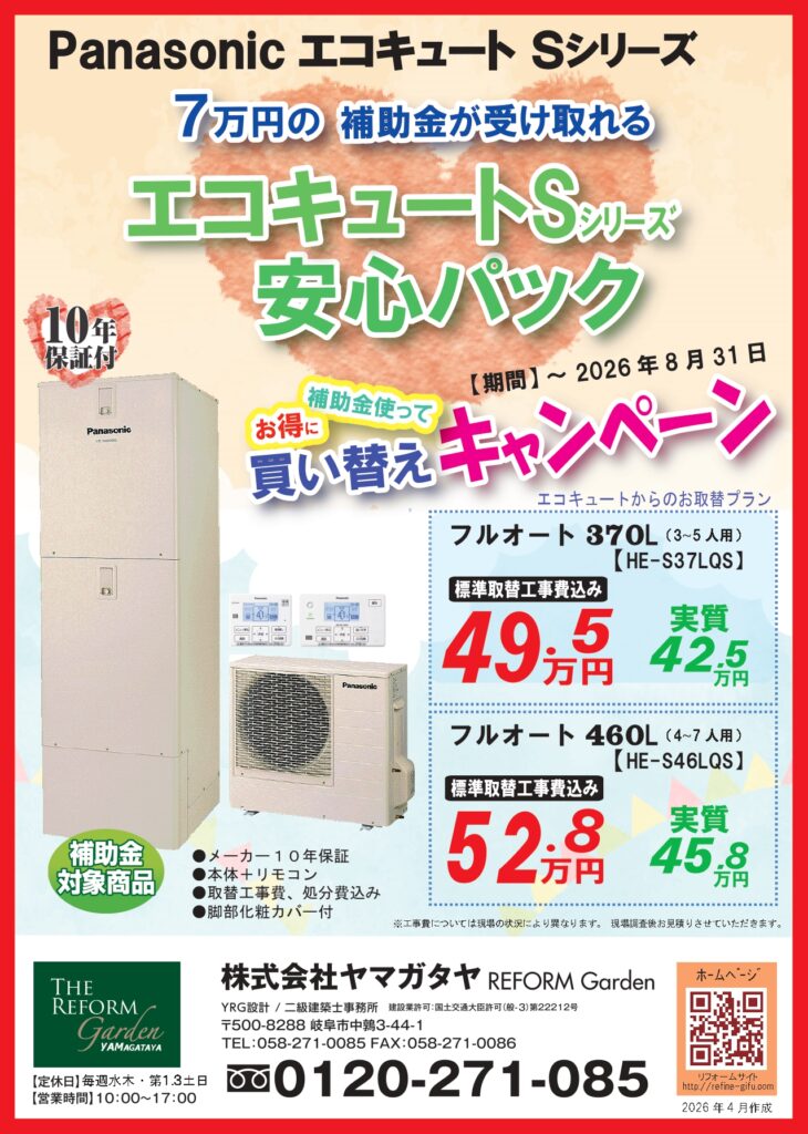 PanasonicのエコキュートSシリーズなら国の補助金(給湯省エネ2026事業)の申請で7万円が補助されます。