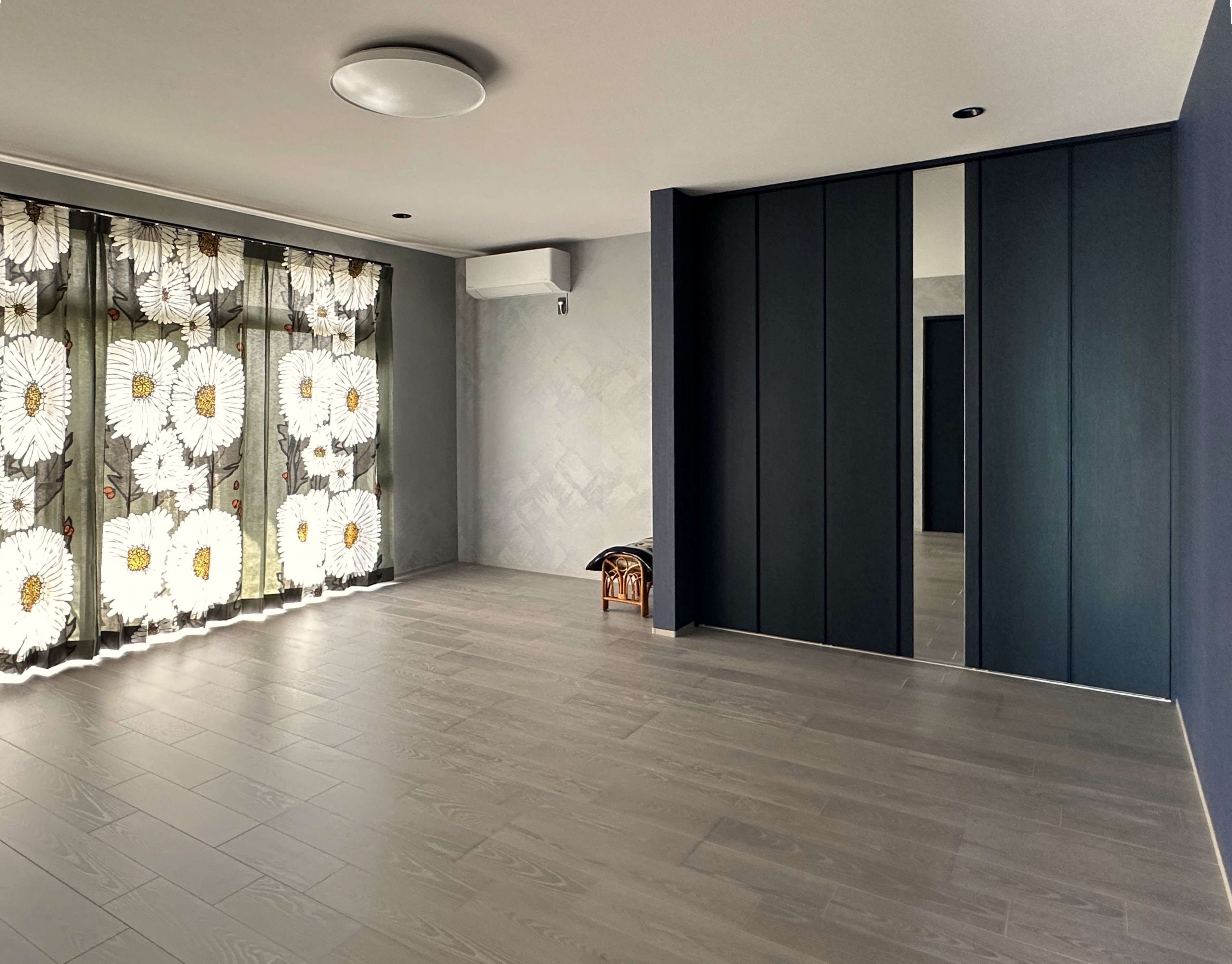 床材、クロスについては、奥様と何度も打ち合わせを重ねて選定しました。和室との境の壁面には、クローゼット扉色に併せ、ネイビー色の壁紙を貼っています。ミスティグレー柄の床とともに個性もありながらシックな雰囲気にまとまりました。奥様の選ばれたカーテンが空間に華やかさをプラスしています。