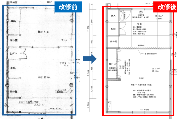 床の間・縁側のある2間続きの和室を、和室+洋室にリフォームしました。