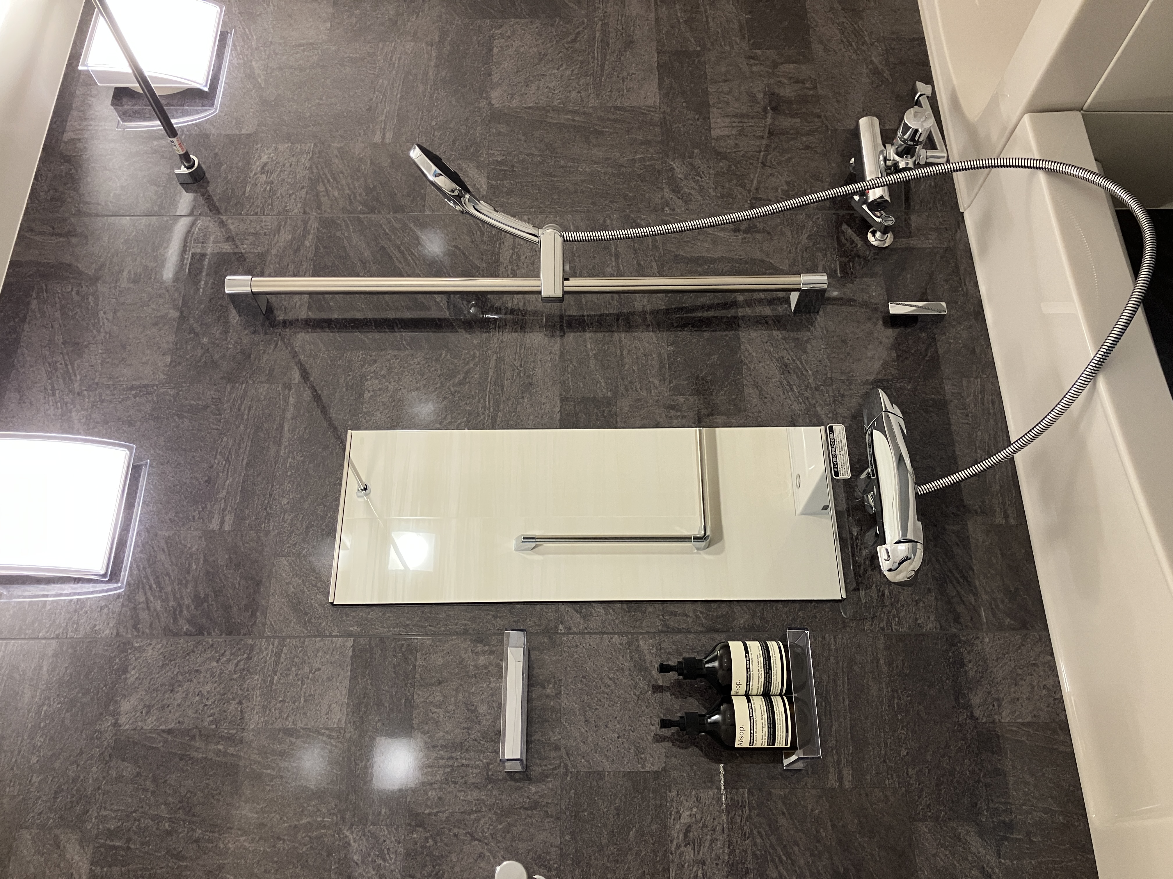 既存の浴室では浴槽横にL型の手すりがありましたが、加えて洗い場にも手すりを設置。シャワーフック兼用の握りバーを
